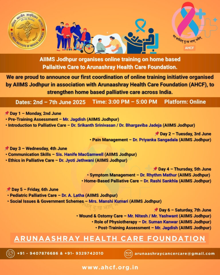 Arunaashray Health Care Foundation (AHCF), in collaboration with AIIMS Jodhpur, proudly announces a 6-day online training program on Home-Based Palliative Care. This initiative aims to empower healthcare professionals across India with essential knowledge and skills to deliver compassionate, effective, and home-based care to patients with life-limiting illnesses.